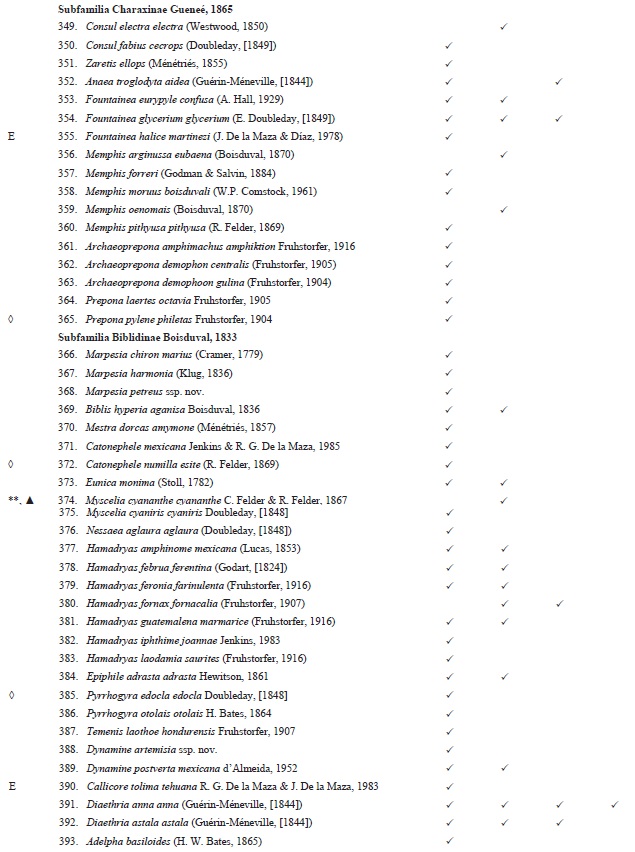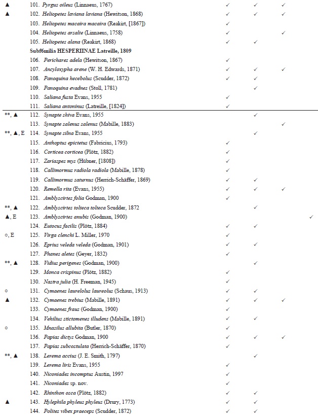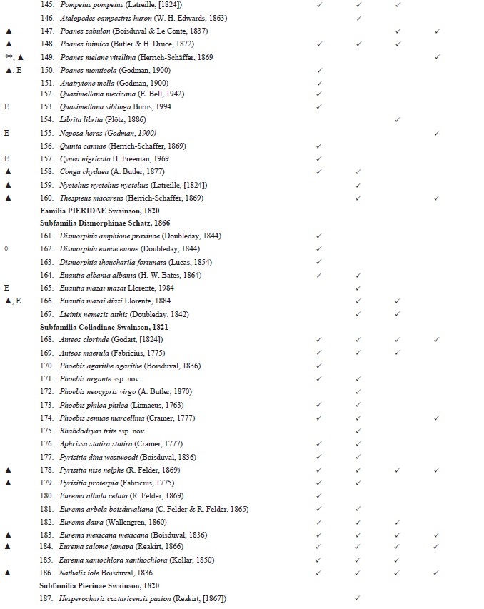 La lista de especies se elaboró tomando como base los ejemplares recolectados junto con los registros previos incluidos en la Megabase Mariposa del Museo "Alfonso Herrera" de la Facultad de Ciencias de la UNAM, y una colección particular (Colección Galindo). Para el arreglo taxonómico de la superfamilia Papilionoidea se siguió el orden de las familias propuesto por Van Nieukerken et al. (2011), y dentro de las familias la nomenclatura adoptada por Llorente-Busquets et al. (2006); y para la familia Hesperidae, los estudios morfológicos y moleculares realizados por Warren (2006) y Warren et al. 2008, 2009.