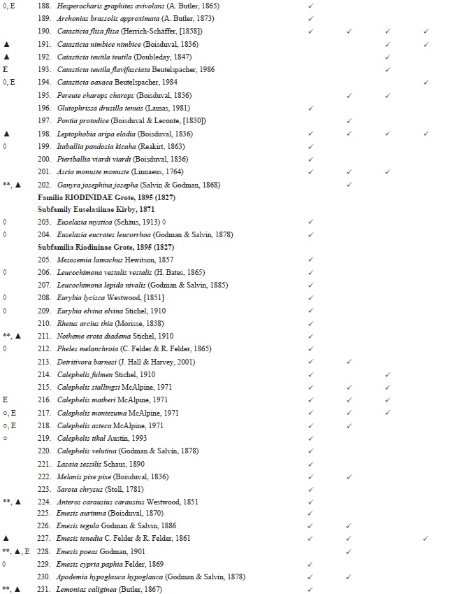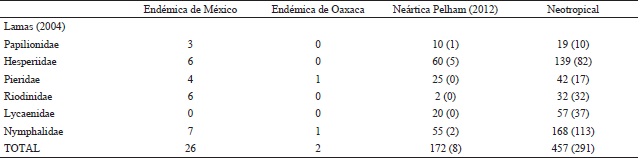 México posee 423 especies y subespecies endémicas de Papilionoidea según la cifra dada por Luis et al. (2011). Más tarde se volvieron a contabilizar consideranto hasta el nivel subespecífico, habiendo para Hesperiidae 155 sspp., Papilionidae 32 sspp., Pieridae 37 sspp., Lycaenidae 10 sspp., Riodinidae 44 sspp. y Nymphalidae 159 sspp., sumando un total de 437 sspp. (Llorente-Bosquets et al., 2014). De las cuales 26 están presentes en la Sierra Mazateca (Tabla 2), y dos son exclusivos del estado de Oaxaca: Catasticta teutila flaviaciata y Morpho theseus utae El 99.34% (457) de los taxones que se encuentran en la Sierra Mazateca presentan una distribución dentro de la región Neotropical (Lamas 2004), pero sólo 288 (62.6%9 son exclusivos a esta región. Y el por el contario, 37.39% (172) de los taxones que aparecen en listas o están presentes en la región Neartica, pero sólo nueve son exclusivos de esta región (Pelham, 2012, desglose por familias en Tabla 3). Para Papilionidae en la región neotropical, en la Sierra Mazateca suman 19 especiessubespecies, para Hesperiidae 140, Pieridae 42, Riodinidae 32, y Nymphalidae 167 y Hesperiidae 140 especies-subespecies. En la región, Neartica, el número de especies por familia es el siguiente: Papilionidae 10 especies subespecies, Hesperiidae 60, Pieridae 25, Lycaenidae 20, Riodinidae 2, y Nymphalidae 55. En la tabla 3 se puede observar el número de taxones que son afines a cada región dentro de los parentesis.