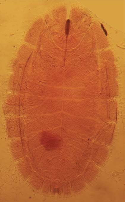 Ventralmente, cabeza, tórax, abdomen y patas amarillo parduzco; superficie ligeramente imbricada y cubierta con setas cortas y largas muy espaciadas; margen de las láminas con setas largas; antenas de cuatro segmentos, geniculados; primer antenómero alargado, longitud igual a la suma de los tres antenómeros restantes; último antenómero engrosado y redondeado, apicalmente de longitud igual al segundo y tercero combinados, provisto de pequeñas setas; ojos ausentes; rostrum trisegmentado, con un filamento rojo en su interior entre los segmentos primero y segundo; primer segmento ancho y corto, segundo segmento escasamente más corto que el primero, tercer segmento con el ápice agudo, de longitud igual a la del primer y segundo combinados, con cuatro setas gruesas apicales.