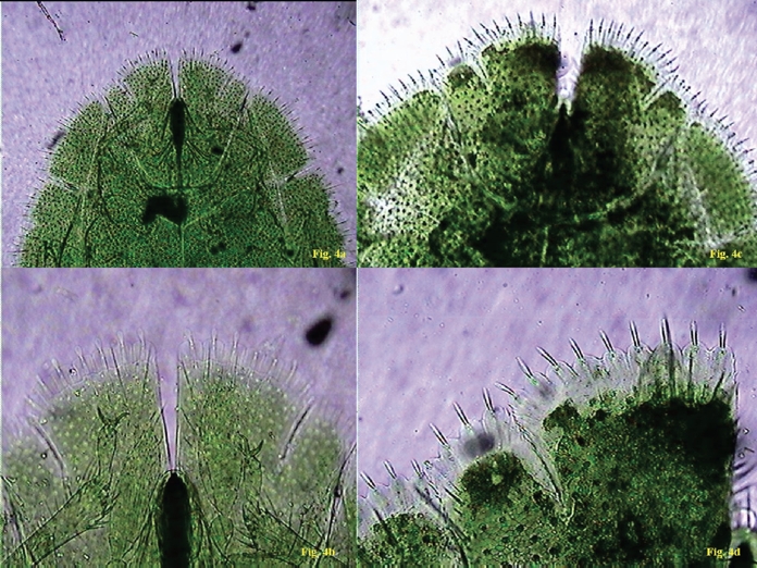 Descripción. Hembra adulta: oval, longitud (3.1 mm); anchura máxima (2.4 mm). Tegumento amarillo parduzco, con pequeñas manchas marrón pálidas; cuerpo bordeado por láminas; coloración dorsal amarillenta hacia el margen y palideciendo hacia el interior; carenas dorsales ausentes; superficie dorsal con pequeñas setas y puntuaciones o papilas granulosas hacia el interior y setas pequeñas y largas hacia el margen de cada lámina lobular. Márgenes del cuerpo con trece lóbulos laminares o corporales, distribuidos de la siguiente manera: dos en la cabeza (cefálica); uno en el protórax; uno en el mesotorax; uno en el metatórax; uno para cada uno de los segmentos abdominales (8). Lóbulos marginales cilíndricos, más largo que ancho, con ápice redondeado (Fig. 4, 4c, 4d) débilmente esclerosados y translúcidos, con setas marginales o flabelas translúcidas y subcilíndricas, alargadas, más o menos fusiformes; ápice más o menos agudo, con una estructura circular de la cual sobresale un sensorio alargado en la base del cilindro flabelar, aparentemente no segmentado.
