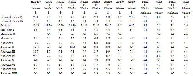 Distribución de flabelas marginales: lámina (cefálica I) con 7 lóbulos a cada lado; lámina (cefálica II) con 3 lóbulos a cada lado; lámina (protórax) con 10 lóbulos a cada lado; lámina (mesotorax) con 5 lóbulos a cada lado; lámina (metatórax) con 5 lóbulos a cada lado; lámina (abdomen I) con 6 lóbulos a cada lado; lámina (abdomen II) con 7-8 lóbulos a cada lado; lámina (abdominal III) con 7 lóbulos a cada lado; lámina (abdomen IV) con 7 lóbulos a cada lado; lámina (abdomen V) con 7 lóbulos a cada lado; lámina (abdomen VI) con 6 lóbulos a cada lado; lámina (abdomen VII) con 4 lóbulos a cada lado; lámina (abdomen VIII) con 3 lóbulos a cada lado (Cuadro 2).
