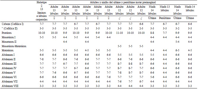 Ninfas de los dos últimos estados preimaginales: 2 hembras del último estado preimaginal con 14 lóbulos laminares en el margen corporal; 1 hembra del penúltimo estado preimaginal con 13 lóbulos y 1 hembra del último estado preimaginal con 14 lóbulos corporales. Distribución de lóbulos laminares y número de flabelas (Cuadro 1).