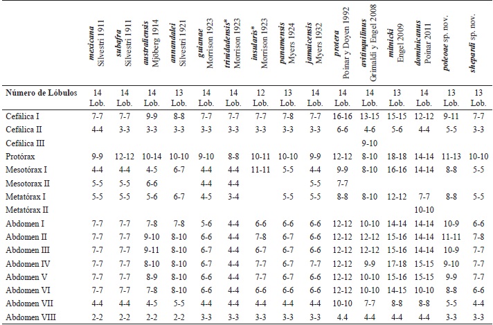 Polimorfismo de Termitaphididae. Termitaradus incluye catorce especies. En el Cuadro 3 se observa el polimorfismo en el número de lóbulos laminares, entre las catorce especies de Termitaradus; se observa que algunas especies presentan entre doce y catorce lóbulos laminares a cada lado del cuerpo. Esto indica que existe un máximo y un mínimo en la lobulación corporal en la familia (Usinger, 1942). Se han colectado hembras adultas y ninfas de los dos últimos estados preimaginales con trece lóbulos (Silvestri, 1921), dado a que no hay cambio entre un estado y el otro. La hembra adulta y su ninfa presentan la misma lobulación. Myers (1932) pensaba que en el caso de los machos, debía de fusionarse un lóbulo, reduciéndose así de trece a doce el número de lóbulos, antes de emerger como adulto, es decir, en algún estado preimaginal, lo cual no es factible. Los machos y sus ninfas tienen doce lóbulos corporales, lo mismo que las hembras, ya que encontramos hembras de trece y hembras de catorce, y sus respectivas ninfas son de trece y catorce lóbulos, es decir que no hay cambio cuando pasan de un estado a otro. En los primeros estados de la ninfa, los lóbulos no se diferencian en un principio, solo cuando comienzan a aumentar de tamaño, hay ninfas de doce, trece y catorce lóbulos corporales. Lo que sí puede variar es el número de flabelas, que deberán a aumentar a medida que el lóbulo se desarrolla más.