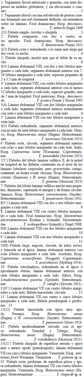 Clave para la identificación de las especies de TermitaradusMyers, 1924, con base en la hembra adulta (Modificada de Engel, 2009).