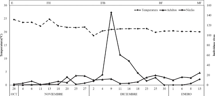 Dinámica poblacional del trips en el cultivo de cebolla. Al inicio del estudio, cuando el cultivo de cebolla se encontraba en etapa de formación de hojas, las poblaciones de T. tabaci eran muy bajas, oscilando los promedios de ninfas entre 1.37 a 3.2 ninfas vivas por planta; mientras que los adultos con un promedio de 0.66 a 1.4 individuos vivos por planta (Figura 1). El máximo poblacional en ninfas se registró al inicio de la formación del bulbo, esto en el mes de diciembre. Al respecto Lewis (1973), mencionó que el aumento en la población de trips estuvo relacionado con el hábito de alimentación de este insecto, situación que ocurre en la formación del bulbo, donde la planta tiene más hojas. Por otro lado, los adultos oscilaron en promedios de 3 a 21 individuos vivos por planta. Para los muestreos posteriores la población de ninfas fue disminuyendo considerablemente, a finales del mes de diciembre e inicio de enero cuando descendió la temperatura no se encontraron ninfas sólo adultos; esto probablemente pudo deberse a que la temperatura bajó durante estos muestreos; al respecto, Samikura (1937) registró que los machos de T. tabaci perecen durante el invierno. Nuestros resultados se relacionan con lo mencionado por Burnstone (2009), quien en un muestreo realizado durante la época de invierno, las ninfas presentaron valores de cero y los adultos oscilaron entre 65 a 120. En la Figura 1 se puede observar las condiciones térmicas en las que se desarrolló nuestro cultivo, que fue de 16.92 a 26.50 °C, temperaturas óptimas para la propagación del trips, ya que las temperaturas que necesita para completar su ciclo de vida oscila de acuerdo a la temperatura, por ejemplo el ciclo podría tardar 37 días a 15 °C; 21 días a 20 °C y sólo 12 días a 30 °C (García 2003).