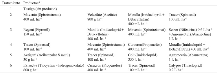 El estudio inició el 28 de octubre de 2013, en un cultivo de cebolla de la variedad Cirrus en Huitzililla, municipio de Ayala, Morelos. A los 17 días después del trasplante del cebollín y hasta cinco días antes de la cosecha se hicieron las pruebas con los insecticidas; se aplicaron seis tratamientos, los cuales fueron rotando los distintos grupos de insecticidas utilizados. En este estudio, cada tratamiento consistió de la aplicación de cuatro insecticidas (algunos de éstos se formaron a base de mezclas) de diferente grupo químico, cada insecticida se aplicó durante tres semanas (±1 semana). La primera aplicación de los insecticidas se inició a los 18 días después de la siembra y una vez que la planta había emergido, posteriormente se realizaron 10 aplicaciones más con intervalos de 7 días entre cada una. La aplicación se realizó vía foliar con un aspersor manual de 15 L equipado con una boquilla de cono y calibrado para aplicar un gasto de 400 L de agua por hectárea. Los tratamientos e insecticidas utilizados en el experimento se indican en el Cuadro 1.