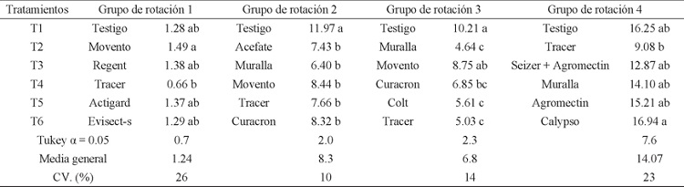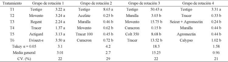 Efecto de los grupos de rotación de insecticidas 1, 2, 3 y 4 sobre la población de ninfas de T. tabaci. En el primer grupo de rotación de insecticidas no se observó un efecto positivo, justo como lo mostró la prueba de comparación de medias Tukey que agrupó a todos los tratamientos con la misma letra (Cuadro 2). Este primer resultado se pudo deber a las bajas poblaciones que se presentaron en la primera aplicación. En cuanto al segundo grupo de insecticidas, el mejor tratamiento fue Acefate, debido a que controló el mayor número de ninfas en comparación con los demás insecticidas (Liñan & Liñan, 2012); en tanto que el testigo presentó un incremento en las poblaciones de ninfas en relación al muestreo previo. Al parecer la efectividad del Acefate se debió a que es un insecticida de ingestión y contacto, contrario a los demás insecticidas que actúan de forma sistémica (Liñan & Liñan, 2012).