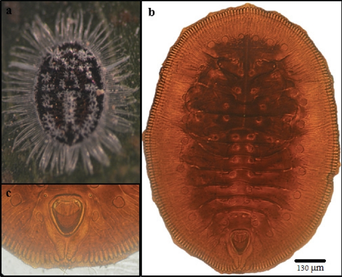 Diagnosis. Pupas sin procesar ni montar (Fig. 1a): color marrón oscuro a negro, elípticas a subcirculares, con pelos vidriosos cerosos que se extienden desde las papilas submarginales y dorsales. Pupas procesadas y montadas en portaobjetos (Fig. 1b): margen lateral. Área del poro traqueal indicada por 2-4 dientes marginales. Vista dorsal. Papilas submarginales de 32-56 μm, por lo general de 40 a 50 μm de largo y 16-18 μm de ancho, no contiguas, la mayoría separadas unas de otras por una distancia de aproximadamente 1/5 de la anchura de una papila; el margen traqueal se pliega y termina dentado; fila de papilas submarginales contigua. De 2 a 3 pares de papilas subdorsales modificadas en la parte cefálica; de cero a un par subdorsal central de papilas sobre el protórax; cada papila varía de 20 a 64 μm; cuatro pares de papilas reniformes dispersas presentes en el escudo cefálico. Orificio vasiforme (Fig. 1c). Es más bien ancho posteriormente, de 68-88 μm de largo y 60-80 μm de ancho; opérculo de 64-80 μm de largo y 56-72 μm de ancho. Vista ventral. Antenas cortas con el ápice en forma de dedo que terminan bruscamente en T1; espinas obtusas presentes a lo largo del margen anterior de las coxas justo a la mitad de la banda rugosa; cada una de las patas medias y posteriores con una seta de cerca de 20 μm de largo situada en la banda rugosa; poro traqueal torácico ausente. Quetotaxia. Cada seta cefálica y setas A1 y A8 abdominales de 24 a 32 μm de longitud; setas caudales de 10 a 30 μm; setas abdominales ventrales de 35 a 40 μm de longitud. (Dooley et al., 2010).