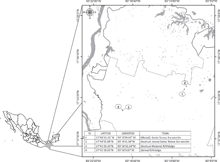Área de estudio. El área de estudio está integrada por parches de vegetación que corresponden a selva tropical, vegetación secundaria (acahuales) zonas agrícolas y ganaderas, dedicadas a la producción de ganado bovino (INEGI, 2013). El estudio se realizó en cuatro sistemas vegetales distribuidos en dos rancherías (R. Santa Teresa 3ra Sección y R. Hidalgo) en el municipio de Juárez Chiapas, cerca de las colindancias con el estado de Tabasco (Fig. 1).