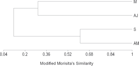 Al comparar la composición de morfotipos de fauna epigea entre las cuatro comunidades vegetales, la selva y el acahual maduro presentaron la mayor similitud (0.612), seguidos por el acahual joven y el maizal (0.297) (Fig. 2).