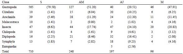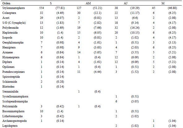 Composición. La composición de los macroinvertebrados estuvo integrada por un total de 1,259 organismos que abarcaron a tres Phyla: Arthropoda (79 morfotipos), Mollusca (20 morfotipos) y Annelida (un morfotipo). La clase que presentó el mayor número de órdenes fue Insecta (Blattodea, Coleoptera, Hemiptera, Hymenoptera, Diplura y Lepidoptera), seguida de Arachnida (Acari, Schizomida, Araneae, Opiliones y Pseudoscorpiones), Diplopoda (Polyzoniida, Stemmiulida, Spirostreptida y Polydesmida), Gastropoda (Archaeogastropoda, Stylommatophora, Basommatophora y Systellommatophora); Chilopoda (Lithobiomorpha, Scolopendromorpha y Geophilomorpha) y un orden en cada una de las clases Clitellata (Haplotaxida), Entognatha (Diplura), Malacostraca (Isopoda) y Symphyla (no identificado). Lo anterior quedó agrupado en nueve clases y 26 órdenes en los cuatro sistemas vegetales. Los órdenes que presentaron mayor número de morfotipos fueron Coleoptera (25), Stylommatophora (17), Hymenoptera (9), Araneae (7), Acari (6) y Hemiptera (6).
