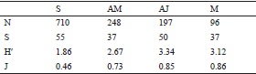 Para la determinación de la estructura de la comunidad se calculó la abundancia (N), riqueza específica (S), diversidad de Shannon (H′) y equidad de Pielou (J) (Krebs, 1999; Magurran, 2006). La similitud entre las comunidades de macroinvertebrados en los cuatro sistemas se estimó con el índice de Morisita-Horn. Los datos fueron analizados con el programa EstimateS Win900 (Colwell, 2012) y Multi-Variate Statistical Package MVSP 3.1. Debido a que los datos no cumplen con los requerimientos de normalidad, se realizó un análisis no paramétrico de Kruskall-Wallis, donde se contrastaron hipótesis estadísticas de las respuestas de riqueza y abundancia de la fauna epigea en los cuatro sistemas vegetales (R Core Team, 2016).