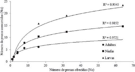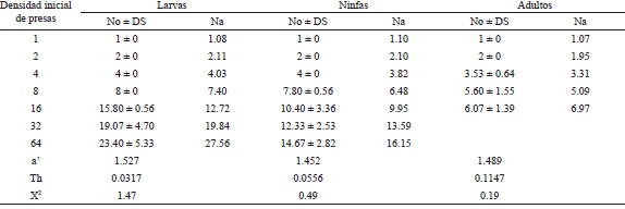 En donde: Na = Número de presas consumidas, a′ = Tasa de ataque constante (tasa de búsqueda instantánea), No = Densidad de la presa, T = Tiempo total disponible (24 h en este experimento) y Th = Tiempo de manipulación. Los modelos matemáticos se obtuvieron mediante el procedimiento PROC NLIN de SAS/STAT (SAS 2008).