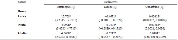 Las regresiones se realizaron iniciando con el modelo cúbico y los coeficientes de mayor orden que no fueron significativamente diferentes de cero se eliminaron, hasta que todos los coeficientes que permanecieron en el modelo fueran significativamente diferentes de cero. El símbolo del parámetro lineal P1 se usó para distinguir entre la respuesta funcional tipo II y tipo III, Si P1 > 0, la proporción de presas consumidas positivamente dependiente de la densidad inicial, describiendo así una respuesta funcional tipo III. Si P1 < 0, la proporción de presas consumidas disminuye con el número inicial de presas ofrecidas, describiendo así una respuesta funcional de tipo II (Juliano, 2001).