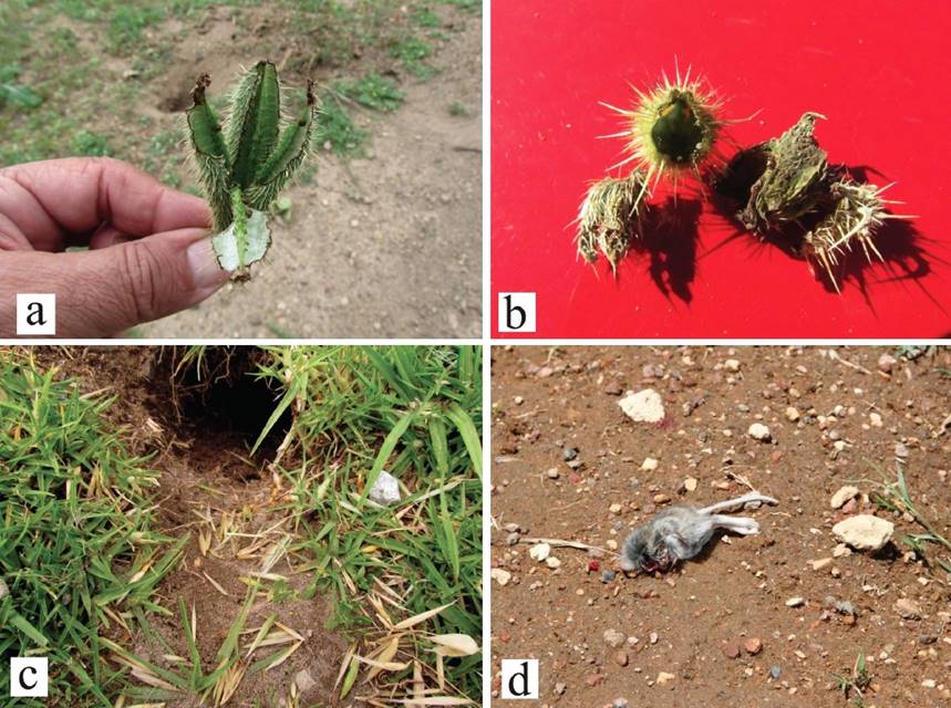 Dentro de los alimentos de origen animal se registraron tres familias (Cuadro 1). Dos de estas familias, pertenecen a la clase Insecta, la familia Tenebrionidae (coléopteros hediondos), en la cual el género Heleodes es muy abundante en la zona de estudio y la otra familia es la Acrididae, representada principalmente por chapulines del género Trimetropis, abundantes principalmente durante el otoño. La familia Cricetidae, también fue registrada con un ratón ciervo (Figs. 1 y 2). También se registró el consumo de carroña de vertebrados como Sceloporus spinosus, Thamnophis sp., Peromyscus sp. etc. Debido a la frecuencia de observaciones de las ardillas consumiendo carroña en la carretera, es probable que la alimentación de roedores y otros pequeños vertebrados, sea un hecho cotidiano, ya que el tránsito vehicular es constante en el área de estudio y las medidas de paso de fauna son escasas, dejando en riesgo de atropellamiento carretero a los organismos y que especies como las ardillas de Perote aprovechan para alimentarse, aunque se exponen al mismo riesgo de ser atropelladas como efectivamente sucede (González-Gallina et al., 2013). Es importante señalar que se observó a la ardilla de Perote ingiriendo carroña de su propia especie, este comportamiento ya ha sido reportado para otras ardillas e incluso pueden llegar a devorar a las crías de sus homólogos (Torrington et al., 2012).