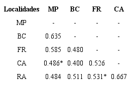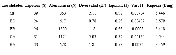 De acuerdo con el índice de Shannon-Wiener (H´), la máxima diversidad se presentó en MP (2.11) y la mínima en BC (0.78). Respecto al índice de equidad (J), CA presentó la máxima (0.59), mientras que BC obtuvo la mínima (0.25). El índice de Margalef (Dmg) registró que MP fue la localidad con la máxima riqueza específica (Cuadro 2). La prueba estadística de t (t0.05=1.96) aplicada a la diversidad (H´) de Scolytinae y Platypodinae demostró que existen diferencias significativas entre los sitios muestreados, con excepción de MP-CA y FR-RA. El índice de similitud de Sorensen (Is) determinó que MP-BC y CA-RA son sitios similares debido a que tienden a compartir el mayor número de especies (Cuadro 3).