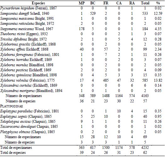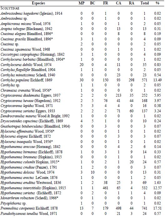 Se recolectó un total de 4,232 individuos, que representan 30 géneros y 62 especies, de las cuales 57 especies y 26 géneros pertenecen a Scolytinae y cinco especies y cuatro géneros representan a Platypodinae. Los géneros Hypothenemus y Xyleborus registraron la mayor riqueza de especies con diez y siete respectivamente. La especie Premnobius cavipennis Eichhoff 1878 presentó la mayor abundancia con 741 especímenes lo que equivale al 17.5% del total (Cuadro 1).
