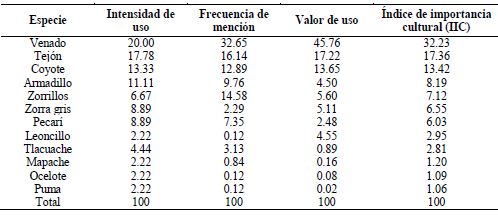 De las 12 especies de mamíferos silvestres utilizados en la mixteca poblana, el venado cola blanca presentó el índice de importancia cultural más alto, luego el tejón y coyote (Cuadro 2).