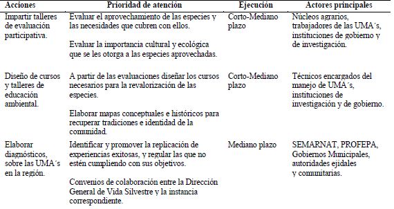 Es necesario establecer como estrategia de conservación de estas especies la revalorización de su función ecológica y económica, favoreciendo un proceso donde las acciones propuestas para el manejo y conservación de la fauna provengan de los beneficiarios; de esta forma, se garantiza la participación y la conservación de los medios útiles para el bienestar de las personas (Cuadro 3).