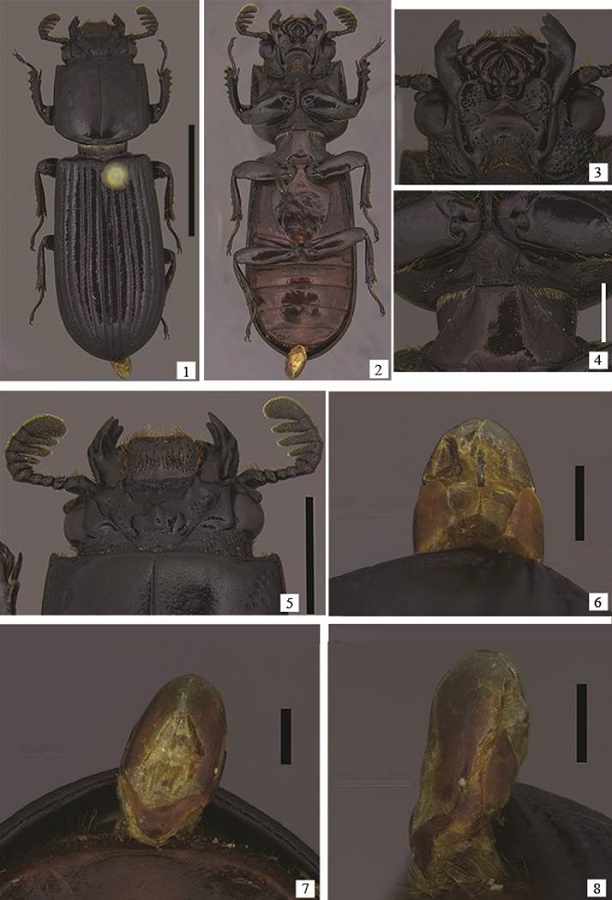 We have analyzed twelve specimens from Coleção Zoológica Prof. Paulo Bührnheim, Department of Zoology, Federal University of Amazonas, Manaus, Brazil (CZPB). Total length of the specimens was measured from the anterior border of the forehead to the apex of the elytra. The pictures were taken with a Leica DFC265 camera attached to a Leica M165C stereoscope microscope, connected to a computer with the Leica Application Suite software, which includes an auto-montage module. Illustrations of the specimens were vectorized using these photographs. The morphological terminology follows Reyes-Castillo (1970), except for the “ponte” (= bridge) and the “mamelão” (= mamelon) that follows Luederwaldt (1931). The mamelon is a structure like a wart in the angle of frontal ridges.