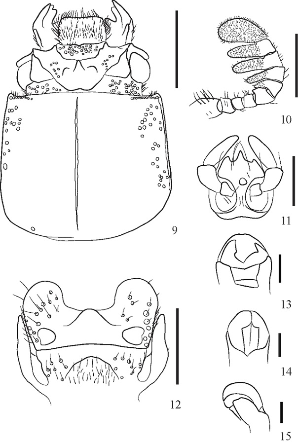 Head male (Figs. 5, 3, 9, 12): labrum square-shaped with pubescence throughout. Anterior edge of the head sinuous with a notch in the middle. External tubercles well developed laterad. Anterior angles of the head straight. Anterior angles of clypeus not visible in dorsal view. Internal tubercles well developed, directed forward and contiguous to external tubercles. Frontal area wider than long, covered by many large punctuations. Mamelon absent. Frontal ridges low with a node in the middle, starting at the apex of central tubercle and ending at internal tubercles. Central tubercle well marked with acute apex, not free and the basis wide. Transversal tubercles well developed and well-marked with round apex. Frontal fossae deep, shiny and with few sparse punctuations. Supra orbital ridges with two tubercles, the first tubercle inconspicuous. Occipital groove complete, very marked and biconcave. Occipital area with many punctuations through its whole extension. Ocular canthus with straight angle and median border with no curves. Bridge absent. Antennal club with five antennomers, the first one reduced and the other four subequal in length. Mandibula with trifid apical tooth, high dorsal tooth and equal-sized internal teeth in both mandibles. Mentum: lobes very rounded with large punctuations and pubescent; small scars, glabrous; median area shiny, smooth and glabrous, protruded, forming a very accentuated convexity at median-superior area. Submentum with little pubescence and few punctuations in the sides. Ligule tridentate, with pointed teeth, the middle one longer than others. Labial palps three segmented; the two distal segments are subequal and longer than first one. Hypostomal process near the mentum, reaching half of the height of lobes. Lacinia unidentate. Pronotum: anterior border almost straight, with straight angles. Anterior marginal grooves shallow with large punctuations, reaching half the width of pronotum. Lateral groove narrow. Few large punctuations, mostly in sides, never reaching half of the pronotum’s width. Median groove narrower in the extremities, reaching neither the anterior nor the posterior border. Prosternal process pentagonal with anterior area wider than posterior. Mesosternal scars deep, glabrous and smooth. Metasternal disc well delimited, smooth-surfaced with few large punctuations at sides. Metastenal scars wide, glabrous and not smooth as metasternal disc. Abdominal sternites glabrous, with marginal grooves. Legs: femur I with scarce pubescence at anterior and posterior borders. Tibia I with one apical spine. Femurs II and III glabrous and smooth. Tibia II and III with one lateral spine each. Elytra: striate with rounded and small-sized punctuations. Aedeagus: In ventral view the medial lobe shows two sclerotized plates far apart from each other and tapering apicad, covering almost all of it. Tegmen wide, in lateral view, reaching 1/3 of medium lobe height. Lateral lobes reaching 2/3 of medium lobe size.