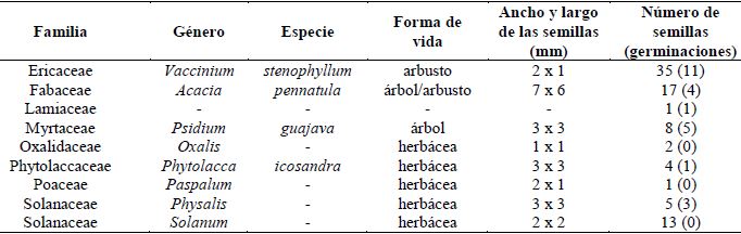 De los pellets colectados en BLP, se identificaron 31 morfoespecies distintas de semillas. Nueve de las morfoespecies fueron identificadas al menos a nivel de familia; ocho especies se lograron identificar hasta género, de las cuales cinco fueron herbáceas y tres leñosas, siendo los géneros más representados Vaccinium (35 semillas), Acacia (17 semillas) y Solanum (13 semillas; Cuadro 1). El 29% de los grupos fecales colectados tuvo semillas que fueron contabilizadas mediante registro directo (369 semillas) o indirecto a partir de las plántulas que emergieron de los pellets desbaratados (50 semillas). De las semillas detectadas directamente sólo 17 germinaron, registrándose 15 morfoespecies. De las semillas restantes, 296 presentaron daño físico, estaban parasitadas o inmaduras. En el registro indirecto, 50 plántulas que emergieron de los pellets desbaratados se clasificaron en 18 morfoespecies.