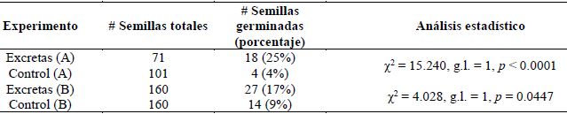 Para el experimento (A), los pellets intactos y semillas control (n = 101 semillas) fueron colocados en charolas de plástico sobre una cama de vermiculita dentro de un invernadero con una temperatura promedio de 17.1±8.9°C. Los pellets y semillas se mantuvieron húmedos y durante dos meses se registró la germinación. Para el experimento (B), las 160 semillas extraídas de los pellets y otras 160 semillas control, fueron sumergidas durante dos minutos en hipoclorito de sodio al 2% y posteriormente colocadas en cajas Petri (cuatro cajas por tratamiento, cada una con 40 semillas) dentro de una cámara de crecimiento con control de luz (16 horas luz /8 horas oscuridad) y temperatura (25°C). La germinación se revisó durante 65 días. Con las semillas de A. schaffneri que no germinaron, se realizó una prueba indirecta de viabilidad con cloruro de tetrazolio, considerando tres categorías de tinción: nula o suave para semillas no viables, media e intensa (50-75% y >75% del embrión teñido, respectivamente) para semillas viables.