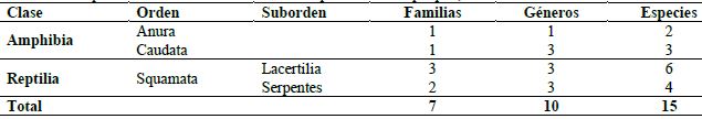 Con un total de 4,762 individuos, la herpetofauna de la EFEZ está integrada por tres órdenes, siete familias, diez géneros y 15 especies (cinco anfibios y diez reptiles) (Cuadro 1). Para los anfibios, la familia Plethodontidae fue la de mayor riqueza con tres especies (60%). En los reptiles, las lagartijas de la familia Phrynosomatidae (cuatro especies; 40%) y las culebras de la familia Natricidae (tres especies; 30%) fueron los reptiles mejor representados (Cuadro 2).
