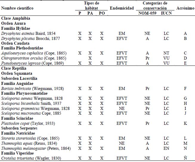 De las 15 especies registradas, 13 son endémicas a México y nueve a la FVT. Un total de nueve especies se encuentran en alguna categoría de riesgo en la Norma Oficial Mexicana NOM-059-2010 (SEMARNAT, 2018), cinco como amenazadas y cuatro sujetas a protección especial, mientras que en la lista roja de la IUCN (2018) 11 especies se consideran en preocupación menor, dos vulnerables, una casi amenazada y una en peligro (Cuadro 2).