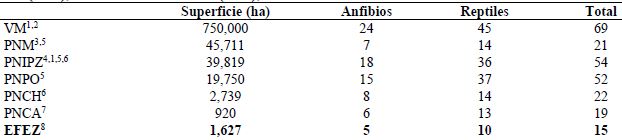 La EFEZ representa el 4.1% de la superficie del PNIPZ y tiene una riqueza que concentra el 27.8% del total de especies registradas para el parque. Adicionalmente, ocupa solo el 0.22% de la superficie del Valle de México e incluye el 21.7% de su herpetofauna. Respecto al número de especies registradas en otros parques nacionales del centro de México, la zona de estudio posee una cifra cercana a La Malinche y El Chico, con 21 y 22 especies respectivamente, los cuales presentan una superficie mayor (Cuadro 3). Por lo que, en términos de la relación especies-área se podría considerar que la riqueza de anfibios y reptiles de la EFEZ es alta. De esta manera, el número de especies obtenido en la zona demuestra la importancia ecológica de esta respecto a la diversidad biológica que alberga la región. Asimismo, denota la necesidad de llevar a cabo estudios acerca de la riqueza y distribución de los anfibios y reptiles que habitan en los bosques templados del PNIPZ.