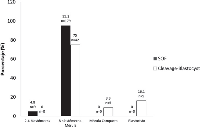En el desarrollo embrionario aquí obtenido se observa que, a las 168 horas de cultivo in vitro, los embriones se encontraban en diferentes etapas de la división embrionaria: 2 a 4 blastómeros (4.8% en SOF), 8 blastómeros a mórula (95.2% en SOF vs. 75% en Cleavage-Blastocyst), mórula compacta (8.9% en Cleavage-Blastocyst) y blastocisto (16.1% en Cleavage-Blastocyst). Esto apunta a que en el medio simple ocurrió una asincronía y retraso del desarrollo embrionario más marcado al compararlo con el medio secuencial humano.