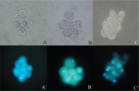 En la figura 3 se muestran fotografías en panel antes y después de la tinción con Hoechst, donde se observan embriones no fragmentados (2 mórulas y 1 blastocisto) clones de hembra O. c. mexicana, desarrollados en medio secuencial humano Cleavage-Blastocyst.