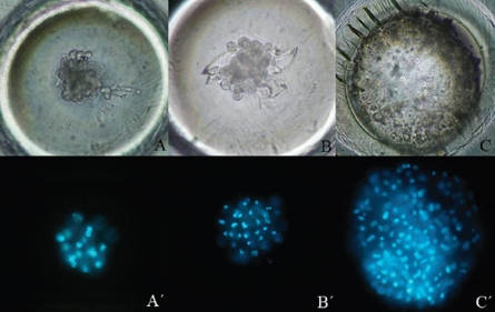 La figura 2 muestra fotografías en panel de embriones de 9 a 17 blastómeros clones de hembra O. c. mexicana, desarrollados en SOF antes y después de la tinción con Hoechst.