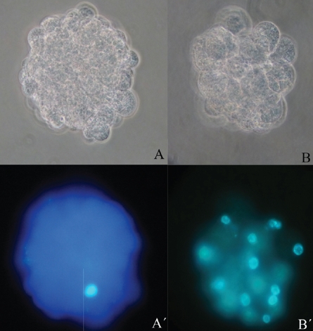 La figura 4 presenta dos embriones clones de hembra O. c. mexicana. La imagen A-A’ muestra un embrión fragmentado donde solo un blastómero presenta núcleo, mientras que la imagen B-B’ corresponde a un embrión donde todos sus blastómeros presentan núcleos.