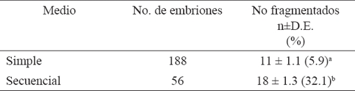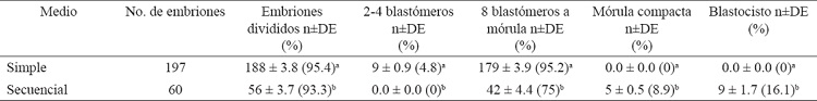 En el cuadro 2 se muestra que, el uso de medio secuencial humano permite un mayor porcentaje de embriones clones de hembra O. c. mexicana no fragmentados, en comparación con el medio simple (32.1% vs. 5.9%, P<0.05).