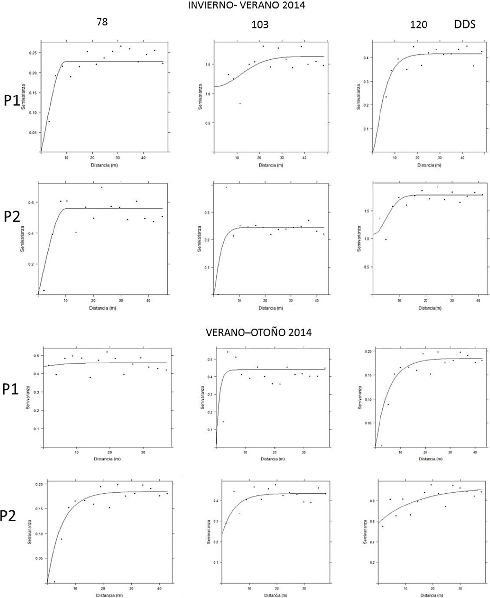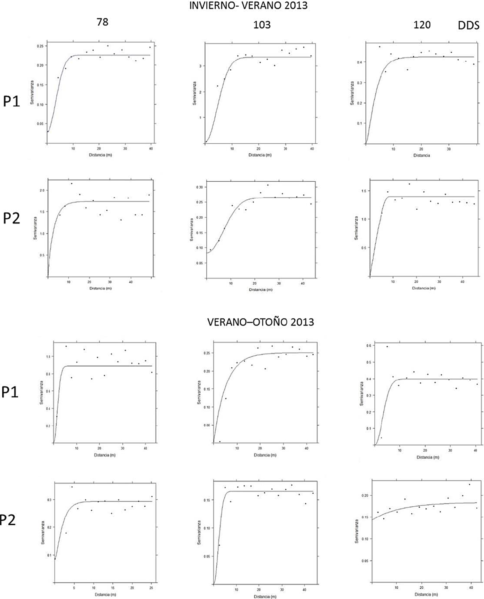 El modelo de tipo gaussiano se ajustó al 50% de las poblaciones determinadas en 2013 y solo en dos poblaciones del 2014 (Cuadro 1), que se expresa en una mayor superficie infestada dentro de la parcela. Su ajuste se dio preferentemente en las etapas fenológicas de espata y/o floración en los dos años evaluados. Por otro lado, el modelo bessel se ajustó en el 20.8% de los semivariogramas obtenidos del comportamiento espacial del Th. simplex en los dos años evaluados (Cuadro 1). Este modelo estuvo asociado con los mayores valores del rango. Los ajustes de los semivariogramas al modelo exponencial en las poblaciones determinadas en el ciclo verano-otoño de 2014, así como a los 78 DDS de la parcela uno del ciclo invierno-verano, 80 DDS de la parcela uno y 113 DDS de la parcela dos del ciclo verano-otoño de 2013. Por otro lado, solo tres poblaciones de Th. simplex se ajustó al modelo esférico, en los muestreos realizados a los de 120 DDS de la parcela dos del ciclo invierno-verano de 2013, así como en la etapa vegetativa de ambas parcelas del ciclo invierno-verano de 2014.