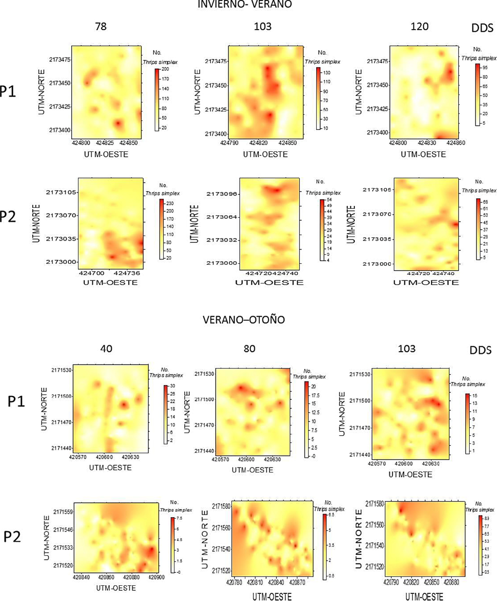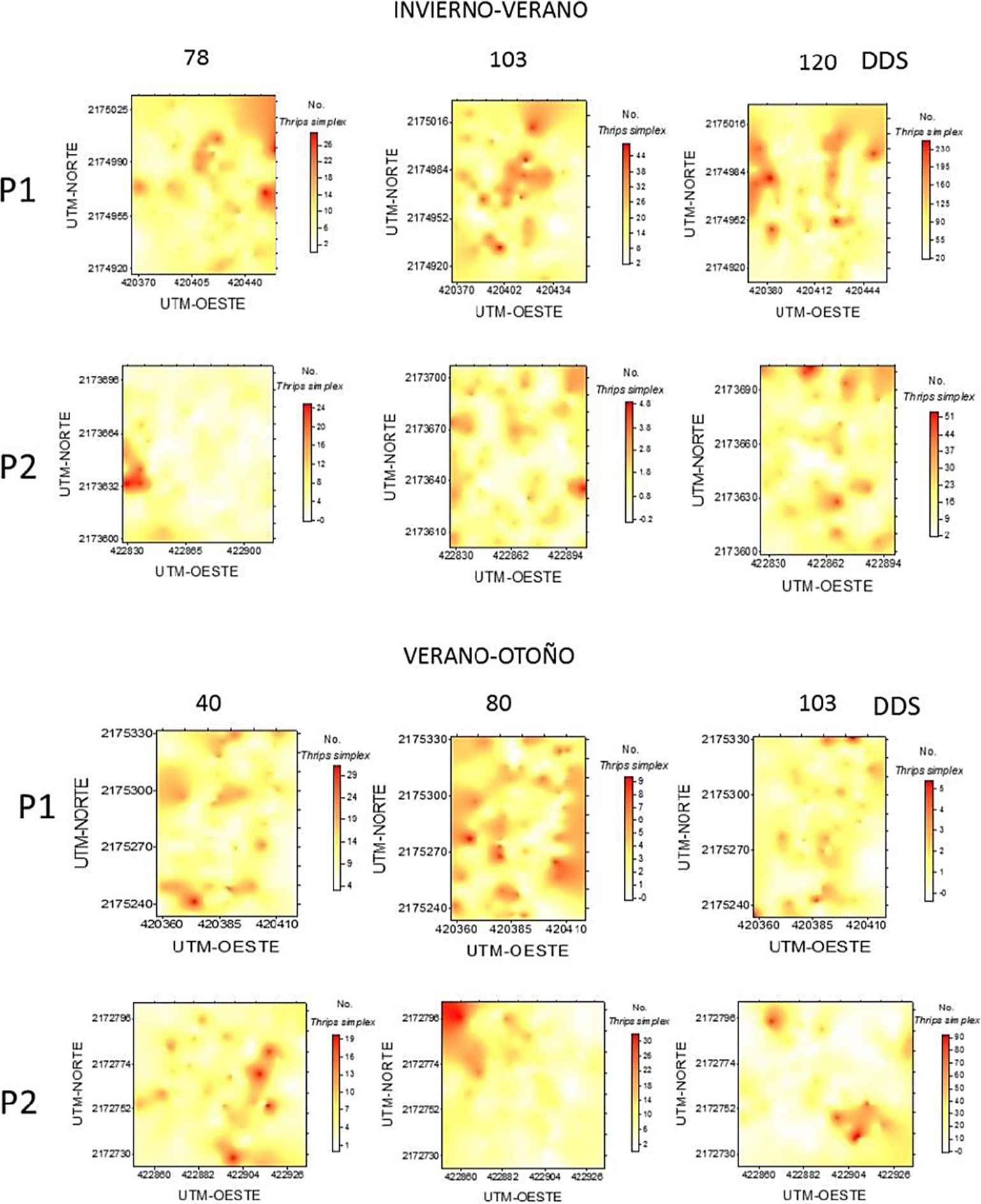 En el año 2014, los centros de agregación durante el ciclo invierno-verano se presentaron de la región central de la parcela con tendencia hacia la región norte y noreste en las dos parcelas evaluadas en las tres etapas fenológicas. Únicamente en el muestreo a los 78 DDS de la parcela dos, los centros de agregación se presentaron en la región oeste (Fig. 4). Para el ciclo verano-otoño, los centros de agregación de la parcela 1 se distribuyeron por toda la superficie, acentuándose en la zona norte y sur a los 78 y 120 DDS, mientras que a los 103 DDS fueron evidentes en la región este y oeste. Por otro lado, los centros de agregación de la parcela dos fueron evidentes en la zona sureste a los 78 y 120 DDS mientras que a los 103 DDS se ubicaron en la región noreste (Fig. 4).