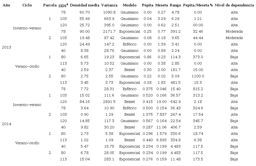 Para determinar la relación entre los datos obtenidos en los muestreos se calculó el nivel de dependencia espacial. Este valor se obtiene al dividir el efecto pepita y la meseta, expresado en porcentaje: con menos de 25% es alto; entre 26% y 75% es moderado y mayor a 76% es bajo (López-Granados et al., 2002).