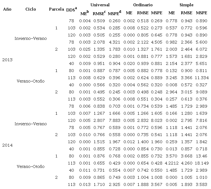 Después de seleccionar el modelo que menor error presentó, se procedió a la interpolación con kriging. Se evaluaron tres modelos de kriging (simple, ordinario y universal) con la técnica de validación cruzada. Se seleccionó el kriging con menor error de precisión para realizar la interpolación con base al error medio (, el cual debe ser cercano a cero (Cruz-Cardenas et al., 2013); de igual forma se determinó error cuadrático medio ( un modelo de semivariograma se considera adecuado si, como regla práctica, el valor del estadístico es cercano a cero (Navas et al., 2008; Vieira et al., 2010), y la media estandarizada del error de predicción que debe ser cercana a cero (Cruz-Cárdenas et al., 2013).