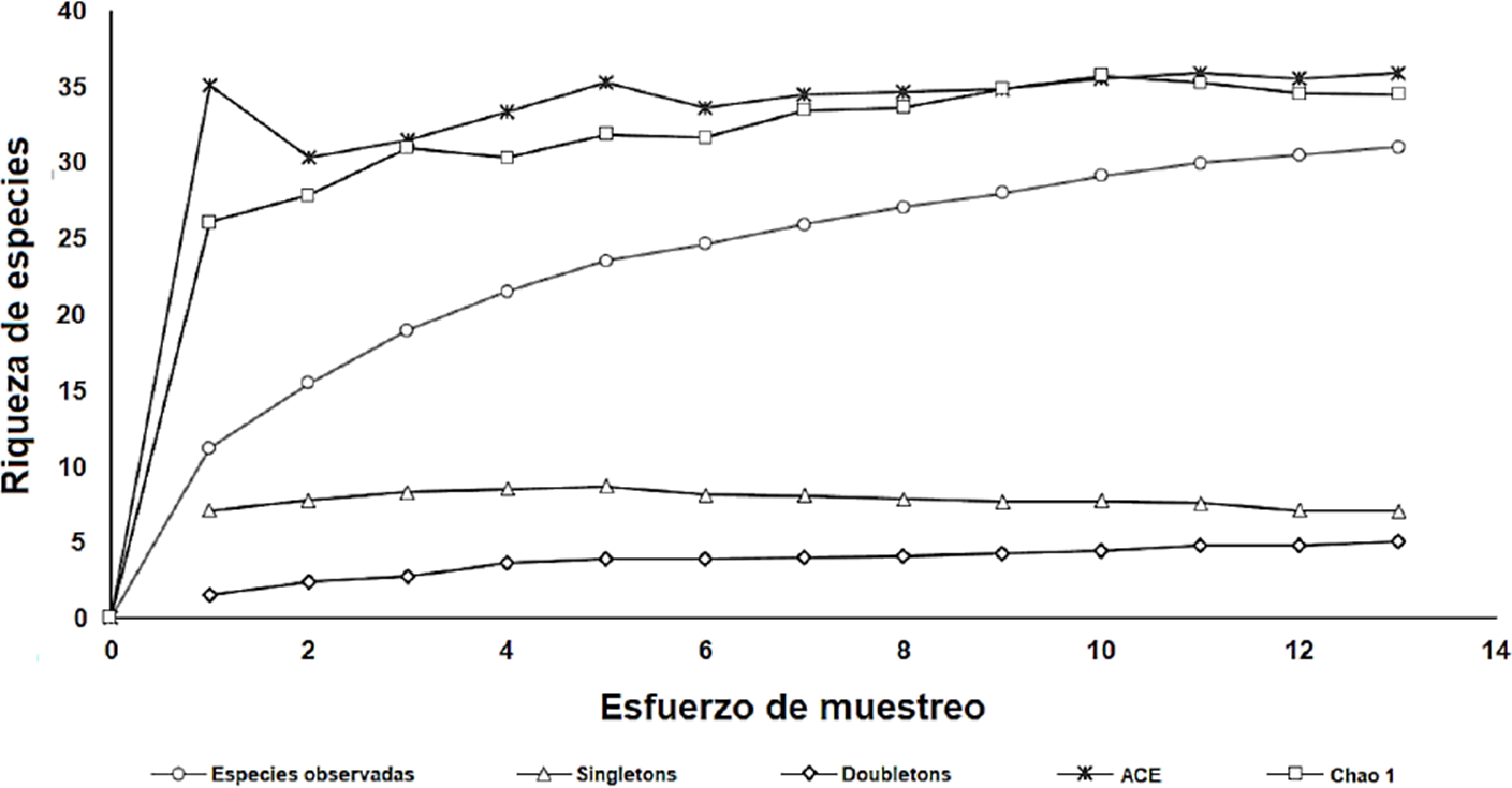 La riqueza de especies registrada en el área de estudio y analizada por los estimadores Chao 1 y ACE indican que la curva de riqueza de especies aun no alcanza una fase asintótica, demostrando así que faltarían por añadir entre tres y cuatro especies al inventario (Fig. 3). Chao et al. (2004) señalan que la falta de completitud de los inventarios puede deberse en primer lugar a un sesgo en la recolecta de datos, o bien, a los valores de las abundancias proporcionales de las especies añadidas a la muestra, considerando que no todas las especies son igualmente abundantes, y que, tampoco habitan de manera simpátrica en un plano espacial o estacional.