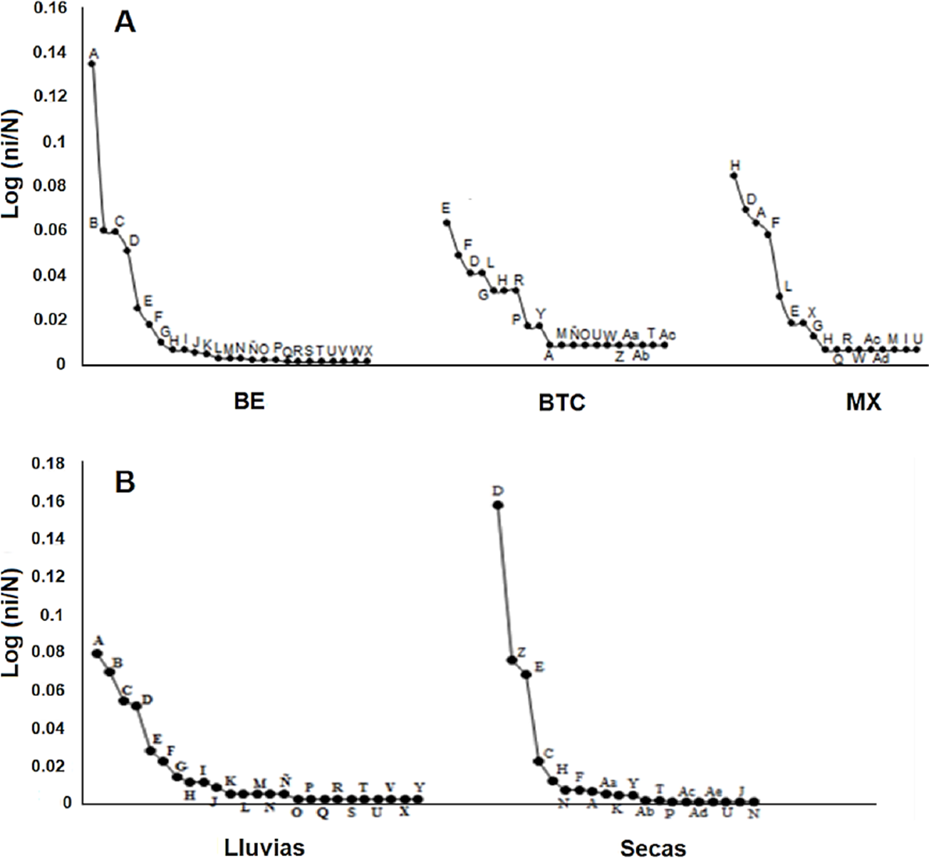 El valor del índice de Shannon-Wiener ajustado al modelo de Jost (2006) fue de: qD = 6.25 para el bosque de encino, qD = 5.29 para el bosque tropical caducifolio y qD = 4.16 para el matorral xerófilo. No hubo diferencias significativas (H = 4.13; P = 1.12) entre tipos de vegetación. Por su parte, el índice de Shannon-Wiener por temporada indicó una mayor diversidad de especies en lluvias (qD = 6.3) que en secas (qD = 2.8), mostrándose diferencias significativas (U = 2.35; P = 0.002) entre estaciones.