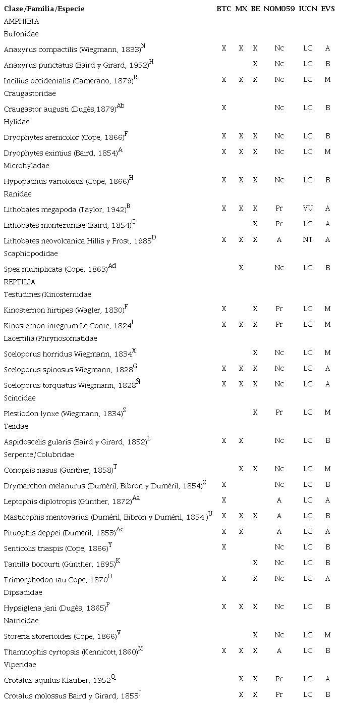 Estatus de conservación. Según la NOM-059-ECOL-2010, 12 especies de anfibios y reptiles se encuentran en alguna categoría de protección. Por ejemplo, Lithobates neovolcanica se encuentra como amenazada (A), mientras que L. megapoda y L. montezumae están sujetas a protección especial (Pr). En cuanto a los reptiles, Masticophis metovarius, Pituophis deppei, Leptophis diplotropis y Thamnophis cyrtopsis se encuentran como amenazadas, Kinosernon hirtipes, K. integrum, Plestiodon lynxe, Crotalus aquilus y C. molossus están sujetas a protección especial (Cuadro 1). En contraste, la gran mayoría de las especies incluidas en la lista roja de la IUCN se ubican principalmente en preocupación menor (LC); L. montezumae y L. megapoda se ubican en vulnerable (VU) y casi amenazada (NT), respectivamente. Finalmente, el índice de vulnerabilidad ambiental (EVS) considera a cuatro especies de anuros en riesgo alto (A), dos en riesgo medio (M) y cinco en riesgo bajo (B). En los reptiles, este índice ubica a seis especies en riesgo alto (A), seis más en peligro medio (M) y ocho en riesgo bajo (B; ver Cuadro 1).