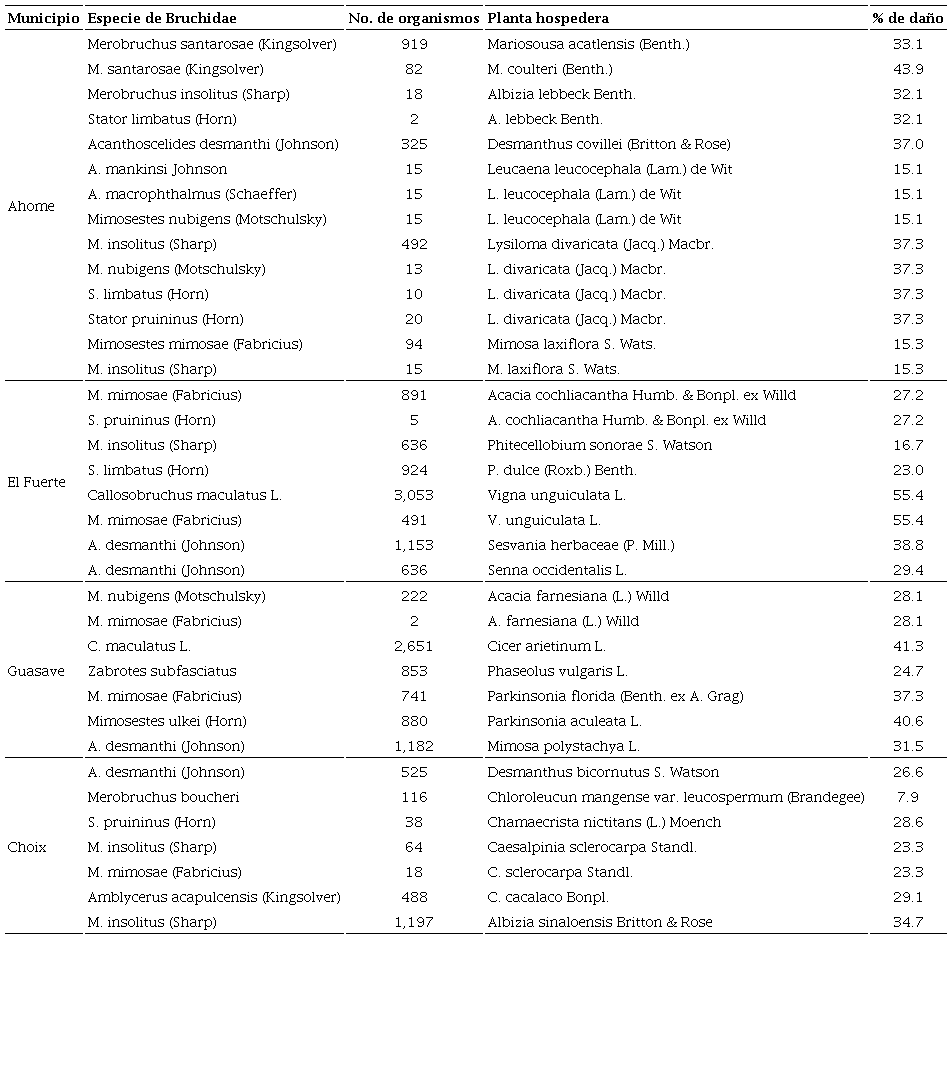 Se identificaron 25 especies de fabáceas: Ahome (7), El Fuerte (6), Guasave (6) y Choix (6). De 68,340 semillas emergieron 19,396 gorgojos adultos, agrupados en siete géneros y 14 especies, con dominancias en especies de Mimosestes (3), Acanthoscelides (3), Merobruchus (3) y Stator (2). De las 25 especies vegetales, 17 de ellas fueron atacadas por una sola especie de brúquido, seis por dos y las restantes dos por una sola especie de Bruchidae. En Ahome, la especie de brúquido más perjudicial fue Merobruchus santarosae, con 43.9% de daño sobre Mariosouza coulteri y 33.1% sobre M. acatlensis; en El Fuerte, Acanthoscelides desmanthi causó daños del 38.8% a Sesvania herbaceae y 29.4% a S. occidentalis; en Guasave, los mayores daños correspondieron a las especies Callosobruchus maculatus (41.3%) sobre Cicer arietinum, Mimosestes ulkei (40.6%) sobre Parkinsonia aculeata y Mimosestes mimosae (37.7%) sobre Parkinsonia florida; en Choix los mayores daños correspondieron a Merobruchus insolitus (34.7%) sobre Albizia sinaloensis y Amblycerus acapulcencis (29.1%) sobre Caesalpinia cacalaco.