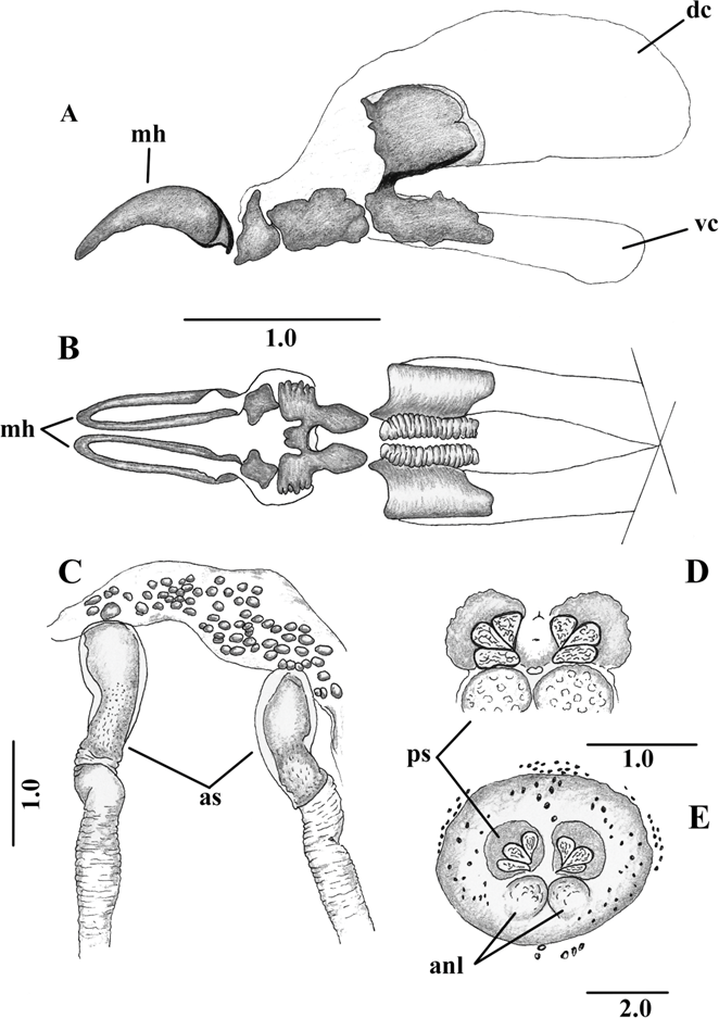 Larval description. Second Instar. Body with 12 visible segments, oval-shaped, narrow at posterior apex. Tegument smooth and cream-colored with sclerotized spine-like plates. Pseudocephalon: with two upper plates at middle. Cephaloskeleton: in lateral view mouth hooks projecting from mouth aperture, two times longer than its basal width, with its apical third curved, and with a dorso-basal pointed projection; dental sclerite blunt, and intercalary sclerite fused with the base of mouth hooks, leaving a small fenestra between them; basal sclerite a little longer than mouth hooks, nearly straight dorsally, and with an anterior-ventral projection that could represent the intercalary sclerite fused; dorsal cornu with the sclerotized portion about as long as basal sclerite, wide at middle and ending in a very thin posterior projection, the translucent portion large with the dorsal margin convex and the ventral margin nearly straight; ventral cornu with the sclerotized portion about half the length and as broad as dorsal cornu, the membranous translucent portion stick-like, as long as dorsal cornu, but one-third to one-fourth its width. Abdominal segments I-III: dorsal area, with anterior region carrying single-pointed sclerotized plates oriented towards the posterior region of the segment, the plates extend well beyond mid-line of segment, central region almost bare, posterior region bare; on segment III the plates do not extend more than midline. Lateral area with sparse plates extending more than half the segment. Posterior area bare, except on segment III that presents some plates. Ventral area with plates restricted to the anterior region, posterior region bare. Abdominal segments IV-V: dorsal area as in segment III, the plates extend beyond mid-line of segment. Lateral area with spine-shaped plates on the whole Surface, becoming less abundant in mid-line, on anterior region the plates are directed posteriorly and vice-versa. Ventral area as previous segments. Abdominal segment VI: dorsal and lateral areas with bands of plates that go around the segment, anterior region plates oriented towards the posterior and vice-versa; mid region of segment with plates sparse, oriented posteriorly. Ventral area with plates on anterior region not extending beyond mid-line, posterior region with less plates, oriented as in dorsal area. Abdominal segment VII: dorsal area with plates restricted to posterior region, lateral area with anterior region bare, plates on the posterior region extend beyond midline, the plates near the midline are oriented towards the posterior region, while the plates on the posterior region are oriented anteriorly. Ventral area as dorsal area. Abdominal segment VIII: anterior region bare, plates only in the posterior region. Spiracle openings: well defined, with orange-brown coloration, two on each side. Plates with a single tip present in irregular bands in upper and lower region, the upper plates are directed towards lower region and vice-versa. Superior spines forward directed and inferior spines backward directed.