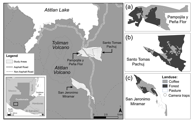 Our main objective was to determine whether shade-grown coffee plantations contribute to terrestrial mammal conservation and to evaluate habitat associations (e.g., land use type and road presence) of mammal local relative abundance patterns (used as a proxy for site preference) and species richness in shade grown coffee farms of the highlands of Guatemala. We conducted mammal surveys with camera traps in three nature reserves with shade-grown coffee plantations in the Lake Atitlan buffer zone. We used a Bayesian hierarchical multi-species relative abundance model (Yamaura et al., 2011; Beesley et al., 2014) that accounts for imperfect detection across species to examine the association between local relative abundances and species richness with environmental and management attributes (i.e., land use type, distance to asphalt road and protected areas). We hypothesized species-specific abundances and species richness at camera trap locations would be higher in forests without coffee crops compared to coffee plantation areas and positively associated to distance from human infrastructure (i.e., roads) and negatively associated to distance to protected areas.
