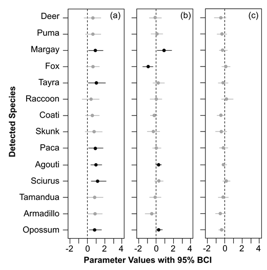 Rhat values (max Rhat = 1.01; mean Rhat =1.00) indicated adequate convergence across all chains and Bayesian p values showed an adequate model fit for all species (Bp range = 0.34 - 0.74; Table 2). Occupancy probabilities across the entire study site ranged from 0.09 (the hooded skunk, Mephitis macroura Lichtenstein, 1832) to 0.77 (the Central American agouti, Dasyprocta punctata (Gray, 1842)); Table 2). The species with the highest occupancy probabilities was a rodent, the Central American agouti and a marsupial, the Virginia opossum (Didelphis virginiana (Kerr, 1792)) (Table 2). Occupancy probabilities for these species were six to seven times higher than large-bodied mammals (i.e., white-tailed deer, Odocoileus virginianus (Zimmermann, 1780)) and carnivores such as the puma (Puma concolor (Linnaeus, 1771)), tayra (Eira barbara (Linnaeus, 1758)), hooded skunk, and northern raccoon (Procyon lotor (Linnaeus, 1758)). Occupancy probabilities for the margay (Leopardus wiedii (Schinz, 1821)), gray fox (Urocyon cinereoargenteus (Schreber, 1775)) and white-nosed coati (Nasua narica (Linnaeus, 1766)), were intermediate across the study area (0.39 - 0.47). The paca (Cuniculus paca (Linnaeus, 1766)), a medium-sized rodent preferred by hunters (El-Bizri et al., 2017), also showed an intermediate value of occupancy probability (0.27).