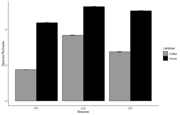In our study, one of the reserves is certified by Rainforest Alliance™. The Rainforest Alliance™ certification indicates that a plantation has been audited to meet standards that require environmental sustainability, reducing or eliminating negative environmental factors (Haggar et al., 2017). Coffee certification programs are also implemented to guarantee coffee under shade contributes to biodiversity conservation (Cruz-Angón & Greenberg, 2005; Gobbi, 2000). The certified reserve in our study, maintained its coffee crops under a diverse, native tree canopy with minimum intervention. More species and a richness increase (ants, birds and butterflies) has been linked to a decrease in management intensity in certified coffee farms (Cruz-Lara et al., 2004; Philpott et al., 2007). This suggests there may be ecological benefits to maintaining high native and natural (as opposed to cultivated) tree diversity in agricultural landscapes to use these as shade for coffee crops. Although we caution interpretation of these results due to our small sample size.