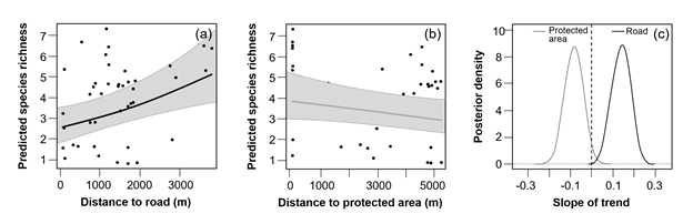 Species richness per site (nj) was estimated as the sum of species with abundance greater than zero in each site (i.e., nj = ∑i (Ni,j > 0)). We evaluated the relationship between species richness and distance to road and protected area by calculating the slope between the log of ni and these distances for each posterior sample of ni, resulting in the derived posterior sample of each slope.