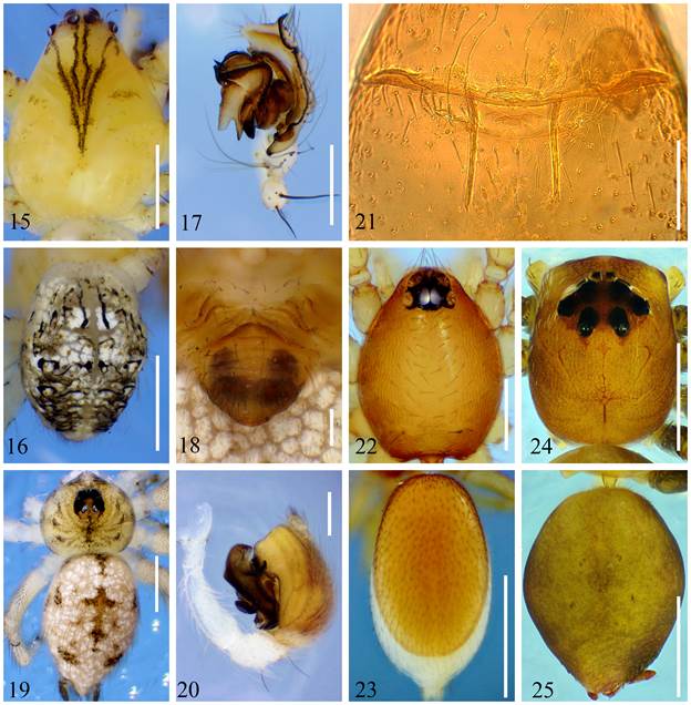 Comentarios. Los ejemplares examinados corresponden al género Mimetus porque el pedipalpo del macho presenta una extensión retrolateral esclerotizada en el cimbio, generalmente con apófisis terminal redondeada, una extensión terminal en el bulbo con múltiples escleritos (Harms & Dunlop, 2009; Gan et al., 2019) (Fig. 17). En cuanto a la hembra, el epigineo tiene forma subtriangular y está fuertemente esclerosado, y las aberturas genitales son discretas (Harms & Dunlop, 2009; Gan et al., 2019; Benavides & Hormiga, 2020) (Fig. 18). No obstante, no existe una circunscripción filogenética moderna y actualmente el género no es considerado monofilético en estudios recientes (Benavides & Hormiga, 2020). Además, por las características de los genitales, podemos considerar que se pudiera tratar de una especie no descrita.