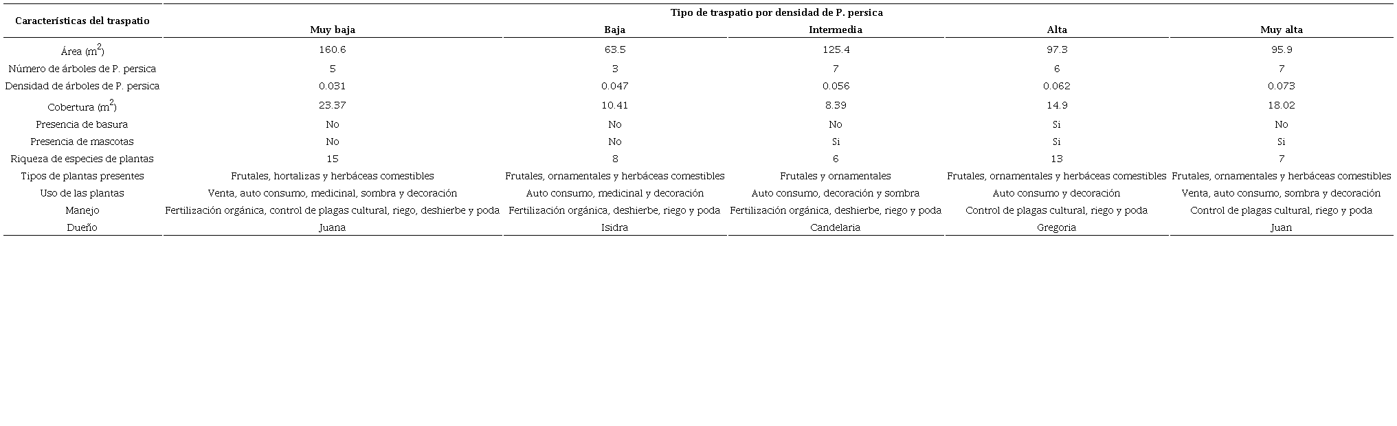 Las especies dominantes en los traspatios pertenecen de las familias Asteraceae, Lamiaceae, Rosaceae, Rutaceae y Verbenaceae. Se tuvo acceso continuo a cinco traspatios del lugar con el permiso de los dueños. Los cinco sitios se definieron de acuerdo con la densidad (muy alta, alta, intermedia, baja y muy baja) de árboles de durazno (Cuadro 1). Los árboles de durazno P. persica de los traspatios llegan a alcanzar alturas de hasta 5 m; sin embargo, en zonas de agricultura intensiva de esta especie, estos son podados y se mantienen a una altura no mayor de 3 m para su manejo agronómico y una fácil recolección de frutos. Este patrón de raleo fue muy recurrente en los traspatios estudiados (Fig. 1). La vegetación en los alrededores del asentamiento humano es definida como bosque de pino-encino.